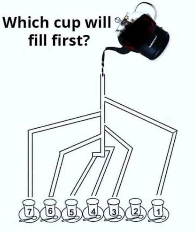 This puzzle might look simple, but it’s trickier than you think! Can you guess which cup will fill first in the image below? The solution requires sharp…