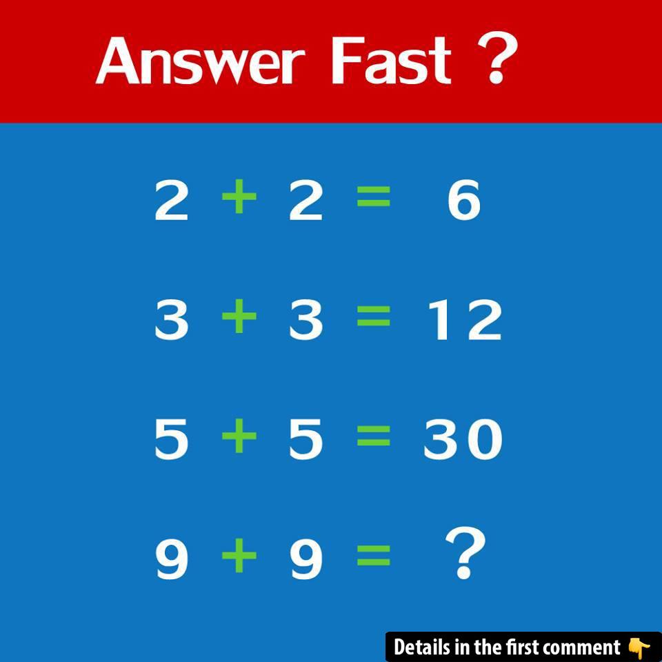 Think you’ve got what it takes to solve this puzzle? Here’s a tricky one for you: 2 + 2 = 6, 3 + 3 = 12, 5 + 5 = 30, and then, 9 + 9 = ?. This puzzle might look like simple addition, but there’s a hidden pattern to discover! Challenge yourself to solve it and explain how you arrived at your answer in the comments. Let’s see who can crack the code first! Ready? Try it now and share your solution!
